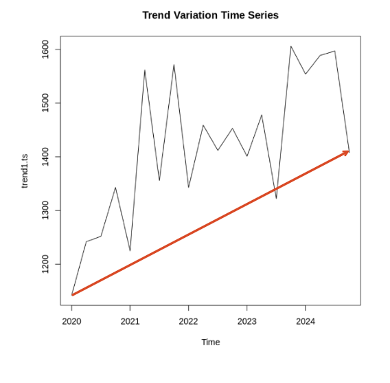 이러한 추세변동의 형태는 시간변화에 따라 직선으로 증가하거나 감소하는 선형 추세가 존재하고