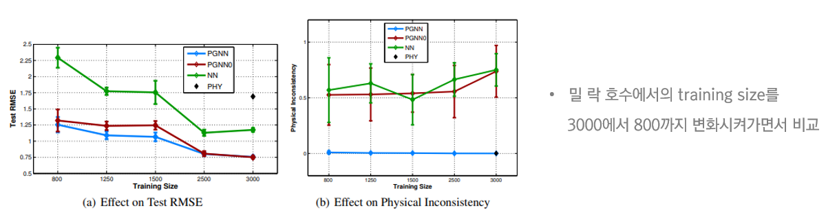 다른 모델들은 training size를 줄이면 RMSE와 Physcial Inconsistency 값이 급격히 증가하게 되는데